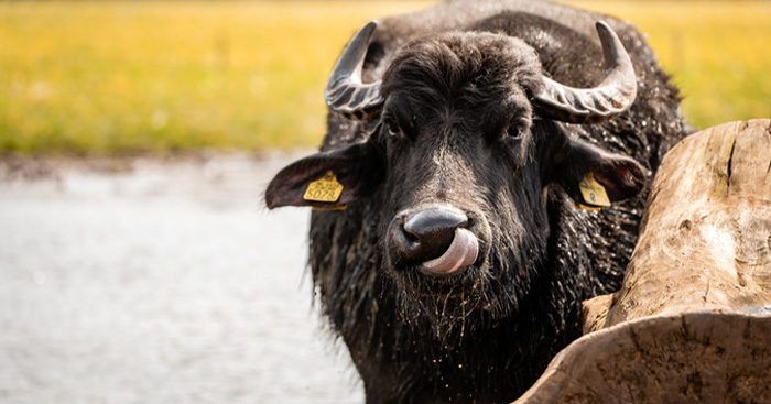 We rijden naar Heeswijk-Dinther voor een bezoek aan een bijzondere waterbuffelfarm, bekend van de tv-serie “Bij ons op de boerderij”. De enthousiaste gastvrouw Lian ontvangt ons in een speciale ontvangstruimte in een nieuwe kas op het erf. Door het glas kunt u, in het seizoen, al de waterbuffels zien grazen in de wei. De 200 waterbuffels zijn gewend aan mensen en erg lief en nieuwsgierig, en er zijn vrijwel het gehele seizoen aanhalige kleine kalfjes.